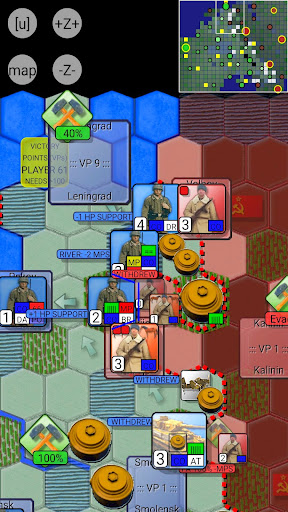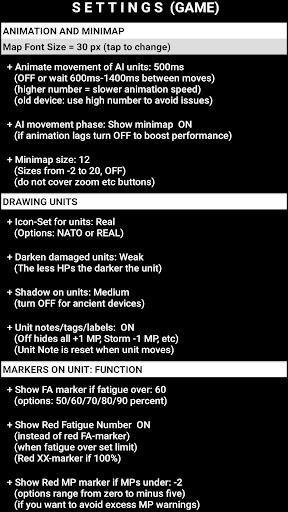 + Settings: Various options are available to alter the look of the gaming experience: Change difficulty level, hexagon size, Animation speed, choose icon set for units (NATO or REAL) and cities (Round, Shield, Square, block of houses), decide what is drawn on the map, and much more.