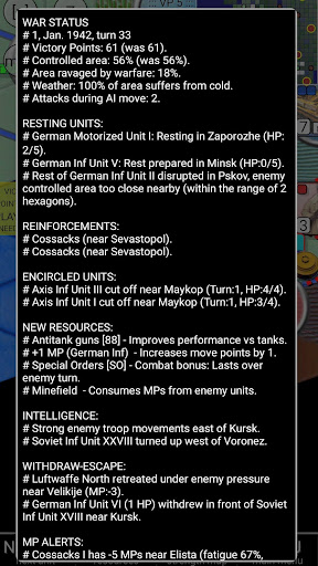 + A large range of WWII units under your command: tanks, infantry, motorized infantry, weak Axis infantry, Waffen SS troops, the German air force and espionage units. Meanwhile, the Red Army starts with weaker infantry, cavalry and tank units, but as the weeks pass, is reinforced with stronger Siberian and T-34 tank units.