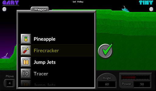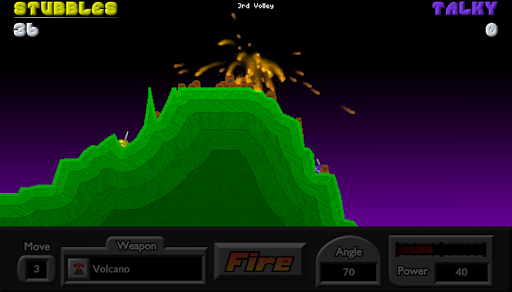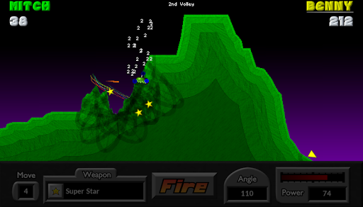 Experience the thrill of launching volley after volley of powerful and fun weapons across the battlefield, using very simple controls. Select your angle, power, and FIRE! Your arsenal of unique and useful weapons includes: Napalm, Firecracker, Skipper, Cruiser, Dirt Mover, and dozens more! This is the light-hearted game of heavy artillery for everyone.