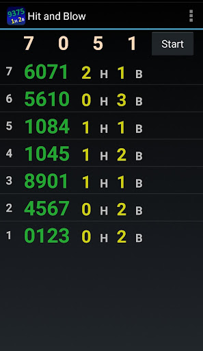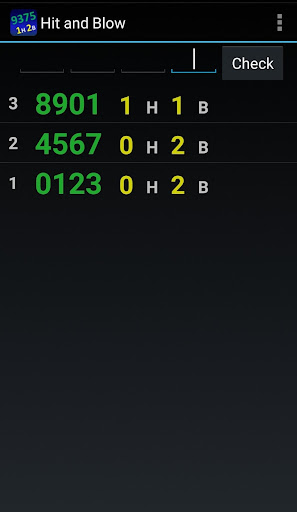 4桁の数字を当てるゲームです。数字を入力すると、場所と数字が合っている個数(ヒット)と、数字のみが合っている個数(ブロー)が表示されます。それをヒントにして、少ない手数で数字を当てることを目指します。