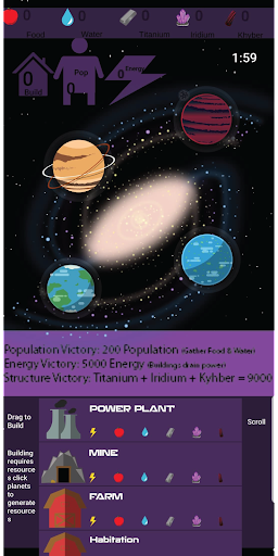 Through construction of buildings and the exploitation of planetary resources, build a planet in the stars. Achieve one of 3 victory types: population, structure, and energy.