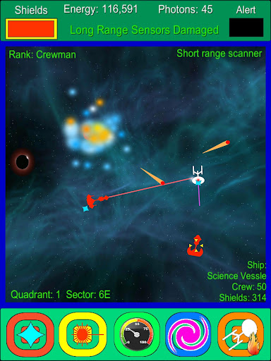 Do battle in each galactic sector, use local short range scanners to determine your enemy’s capabilities, weapons and shield strength. Its possible to battle two enemy ships simultaneously, using phaser to blast one target and homing torpedoes on the other target. Once a sector has been cleared use long range sensors to view all sectors in each of the 4 quadrants, then warp to your next peace keeping mission.