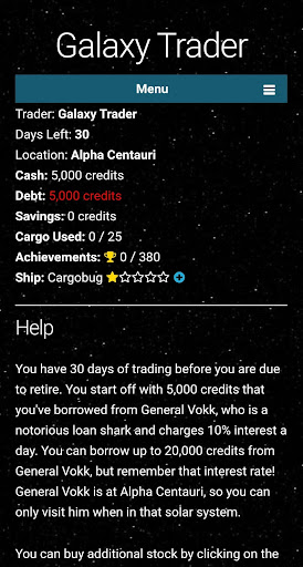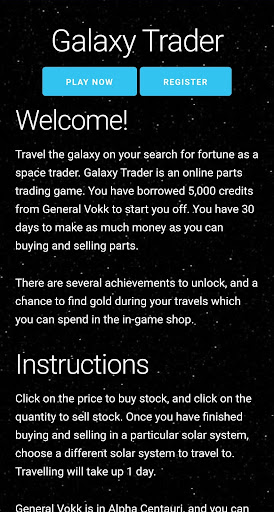 Travel the galaxy on your search for fortune as a space trader. Galaxy Trader is an online parts trading game. You have borrowed 5,000 credits from General Vokk to start you off. You have 30 days to make as much money as you can buying and selling parts.