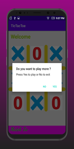 a row wins game.If no player is able to win ,match ties.If you want to play it again Press yes on dialog box asking you permission and if you want to exit,press NO.