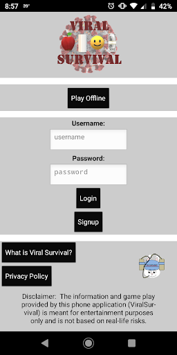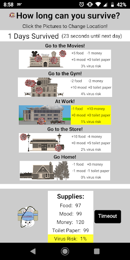 Viral Survival is a strategy game where the goal is to survive as long as you can before running out of supplies or catching the virus. Each location that you navigate to by clicking on its picture will add certain supplies every two seconds, but be careful because you will, likewise, lose other supplies. Also, each location has a specific risk of catching the virus. Each day you survive will put you higher on the Leader Board, but every day is more difficult than the last. See how long you can survive!