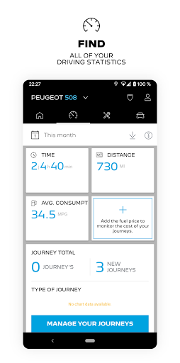 All PEUGEOT models are compatible with the MyPEUGEOT application. However, if your PEUGEOT is not equipped with Bluetooth or does not have the ability to use our Connected Services, the ‘Driving’ tab (which provides details of your journeys, fuel consumption and mileage) is not displayed. You can still enjoy all of the other features of the app.