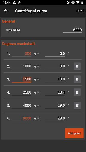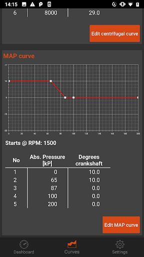 After activating the ‘TUNE’-button, you can adjust the advance manually plus or minus 5 degrees in steps of a degree (crankshaft that is). This result will not be stored in memory though, but can come in very handy finding the optimum advance-curve for your car!