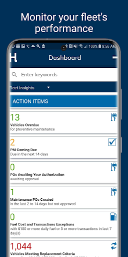 • Monitor vehicle mileage, maintenance, licensing, fuel, accidents, recalls and order status, and access fuel PINs and insurance cards.