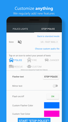 You can customize the lights and text to flash in your favored color and you can also choose custom sirens if you don’t like our presets. Also it’s possible to mirror the text.