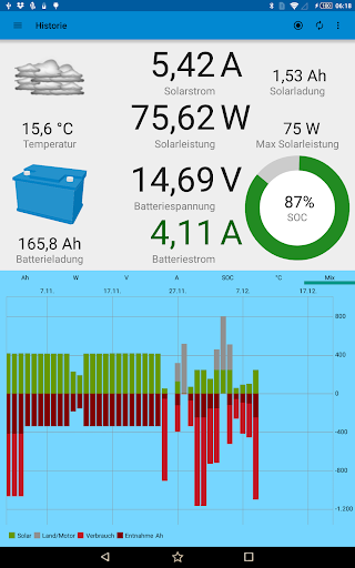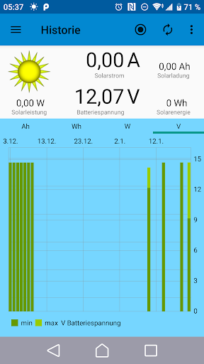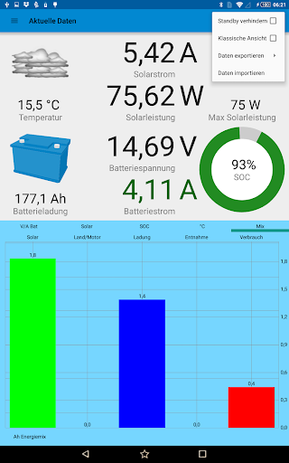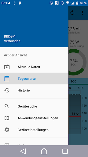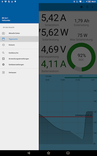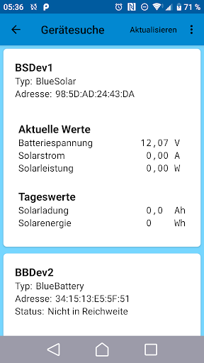 Die ermittelten Werte der BlueSun- und BlueBattery-Geräte werden per Bluetooth von dieser App empfangen und dargestellt.