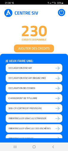 CENTRE SIV est une application mobile professionnel Autocerfa permettant de réaliser avec votre smartphone les démarches administratives dans le cadre du SIV (Système d’Immatriculation des Véhicules). L’application vous permet d’enregistrer facilement en ligne vos déclarations d’achat et déclarations de cession, relié directement au Système d’Immatriculation des Véhicules de votre préfecture. Grâce à notre Centre Agréé de Traitement en Ligne, validez vos déclarations d’achat et de cession en 3 clics. Service agréé et habilité par le Ministère de l’Intérieur et par le Trésor Public