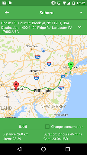 • Calculator for average fuel consumption, trip cost and route cost (including route drawn on the map)