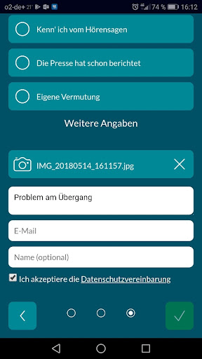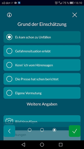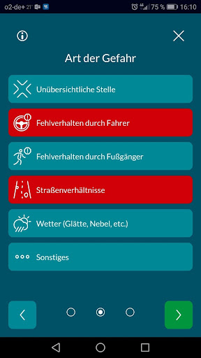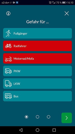 Über die App können Gefahrenstellen im Straßenverkehr schnell und einfach gemeldet werden. Mit nur wenigen Angaben können so andere Verkehrsteilnehmer vor Gefahren im Verkehr gewarnt werden.