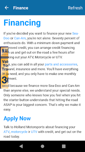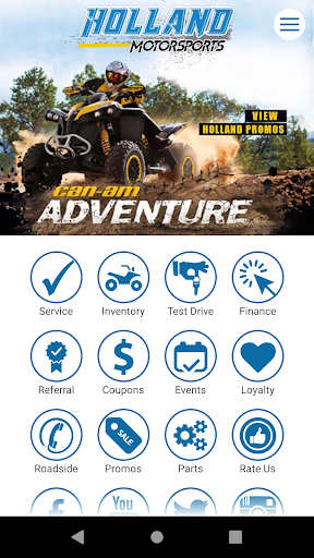 Holland Motorsports App mobile dealer app provides customers and shoppers with an enhanced dealership mobile experience. The mobile car dealership app uses background geo-location for geo-fencing and geo-targeted push notifications to provide customers with relevant specials and loyalty offers. The app also delivers a wide range of features/benefits to customers, including service scheduling, viewing new and used inventory, redeeming mobile offers, sharing dealer promotions, referring family and friends, viewing special events, contacting roadside assistance, booking a test drive, and contacting staff directory.