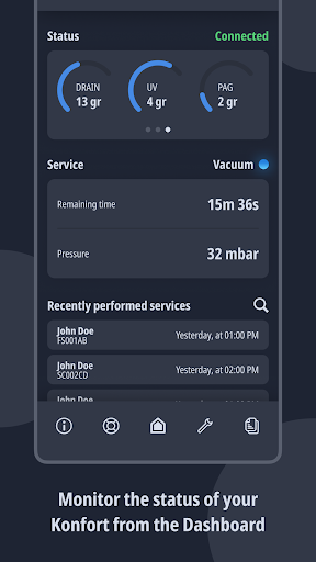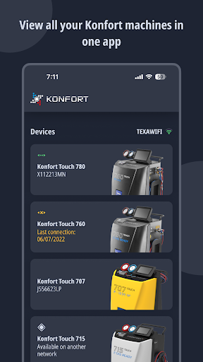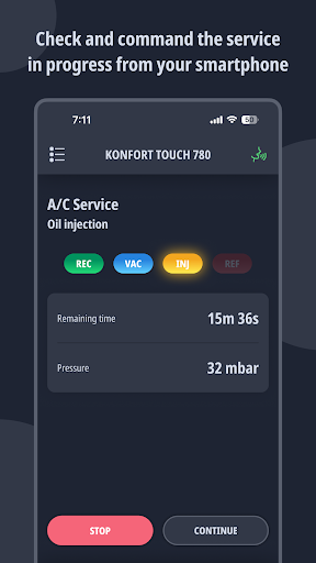 The APP allows TEXA KONFORT charging stations to interface with the smartphone and allows the technician to follow the A/C system service procedures also remotely, directly from the smartphone display. A specific notification system will alert the technician when the service is completed or when the Konfort charging station detects any failures in the A/C system. Furthermore, thanks to its intuitive user interface, the performed maintenance services can easily be checked and managed even when the station is switched off.