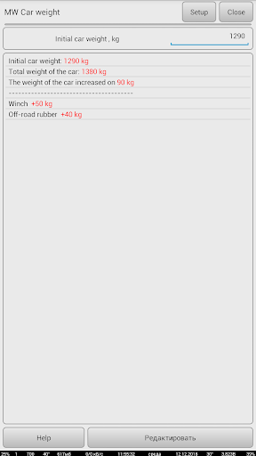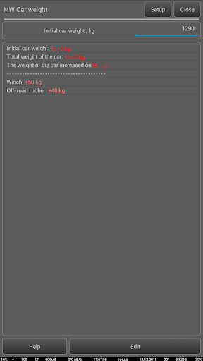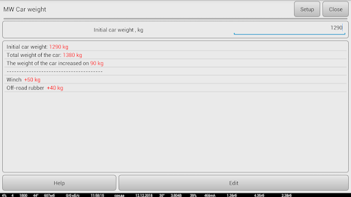 The program allows to set the initial weight of the car and to add the weight of various units added or deleted when tuning the car and to count the total weight of the car