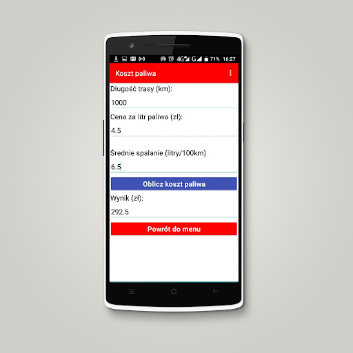 Prosta aplikacja adresowana dla wszystkich użytkowników samochodów. Wystarczy podać wymagane dane, a aplikacja obliczy koszt paliwa, średnie spalanie samochodu lub odległość możliwą do przejechania przy danej ilości paliwa.