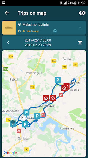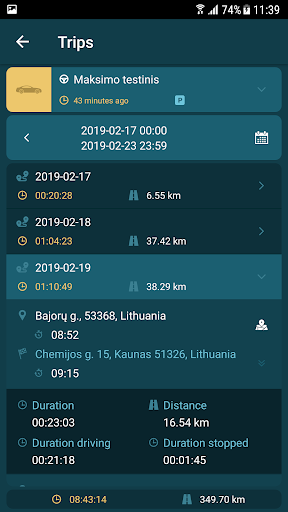„Car In Phone Lite“ also allows you to view the vehicle’s travel history for the selected time period with the following info: