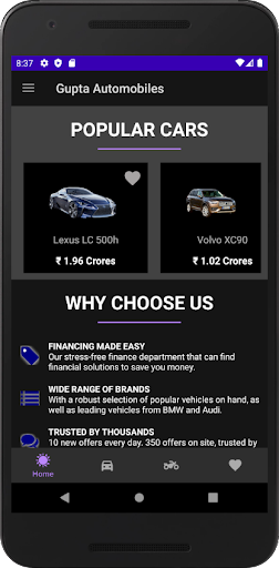 Gupta Automobiles App is a free app that’s your best source of information on cars and bikes and keeps you informed about latest automobiles, also gets you prices, pictures and a lot more. Gupta Automobiles App comes in Dark Mode also to take care of your eyes and also save your mobile battery. Gupta Automobiles App also allows you to keep your favorite cars and bikes separate. Gupta Automobiles App is equipped with EMI calculator to get you EMI estimation immediately.