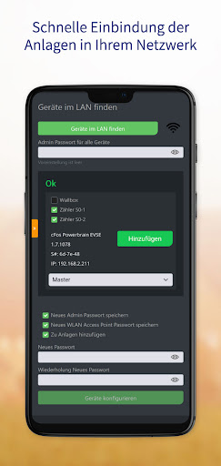 Einfaches Verbinden von cFos Power Brain Wallboxen mit dem bestehenden WLAN. Außerdem können Sie nach neuen Geräten im Netzwerk suchen und diesen eine Rolle ‘Master’ oder ‘Slave’ zuweisen. Dadurch lassen sich Anlagen mit mehreren Wallboxen einfach konfigurieren. Sie können auch mehrere Wallboxen oder sogar cFos Charging Manager Anlagen verwalten
