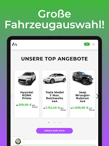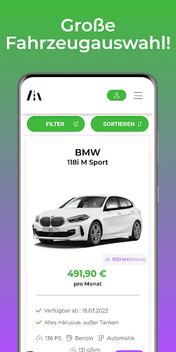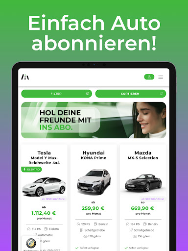 Jetzt die APP runterladen und das Auto in Zukunft abonnieren statt kaufen – alle Kosten sind im monatlichen Abo-Preis schon enthalten (außer Tanken)