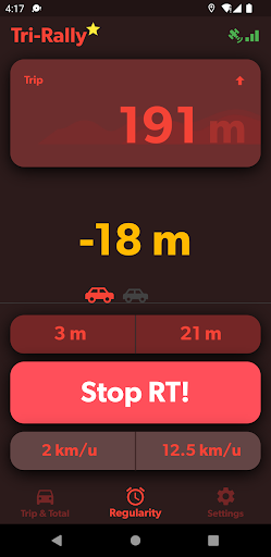 Set the desired or given regularity speed, press start and see how many meters you are too early or too late at any given position. Also a small car shows you the same information. This gives the navigator more time to give good directions to the pilot.