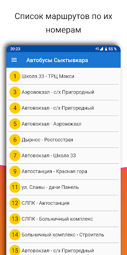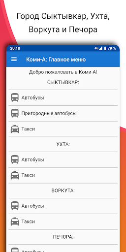 Коми-А это приложение для жителей и гостей Республики Коми. В приложении вы найдете расписание автобусов и номера такси городов Сыктывкар, Ухта, Воркута и Печора в удобном формате. Работает оффлайн.