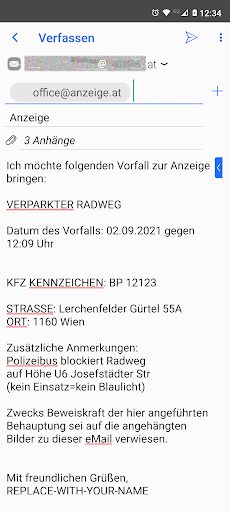 Natürlich kannst Du diese App in jeder Stadt verwenden, wo das zuständige Ordnungsamt (oder eine vergleichbare Autorität) eine Anzeige von Falschparkern via eMail entgegennimmt. WICHTIG: DU MUSST DAZU DIE EMAIL-ADRESSE IN DEN EINSTELLUNGEN ÄNDERN. Denn es macht wenig Sinn wenn Du einen Falschparker in München melden möchtest und dazu die Stadt Wien kontaktierst. Vor der ersten Anwendung dieser App solltest du ohnehin in die EINSTELLUNGEN denn dort hinterlegst du auch deinen NAMEN der in der letzten Zeite der zu erstellenden eMail angezeigt wird.