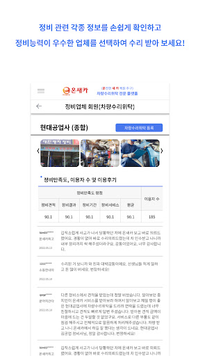 온새카 모바일에서는 정비업체의 각종 정비관련 정보를 조회하여 차량수리위탁(포인트 적립)을 할 수 있고, 참여마당·공지사항 등을 볼 수 있습니다.
