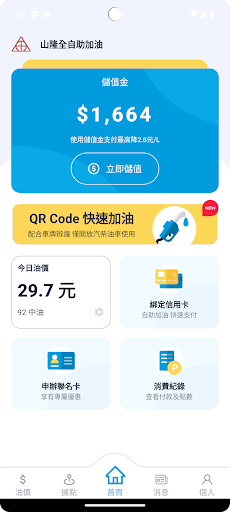 新一代山隆全自助加油站支付app,提供會員儲值,加油紀錄查詢,綁卡交易,查詢油價和周邊山隆加油站站點等各式功能,期望能以嶄新的面貌提供更便捷的服務。