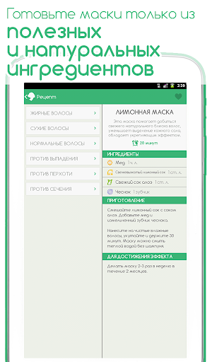 Мы знаем, что вам ценно ваше время и поэтому все маски оформлены с упором на простоту и удобство пользования. Рецепты разбиты на умные секции, где четко обозначены необходимые ингредиенты, время держания маски, регулярность нанесения – следуя этим простым шагам вы быстрее добьетесь нужного результата.