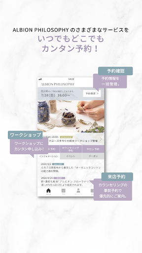 カウンセリング、肌分析、ワークショップの予約はアプリから。