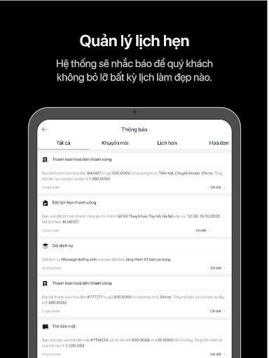 Theo dõi chi tiết lịch sử hoá đơn: làm dịch vụ, mua sản phẩm, mua thẻ, mua gói, sử dụng gói.