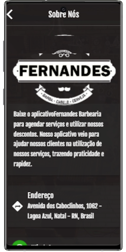 Baixe o aplicativo Barbearia Fernandes para agendar serviços e utilizar nossos descontos. Nosso aplicativo veio para ajudar nossos clientes na utilização de nossos serviços, trazendo praticidade e rapidez.