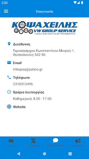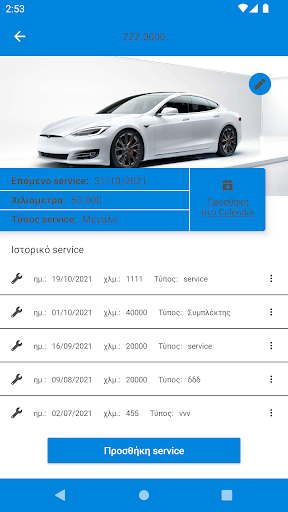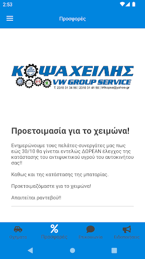 Η εφαρμογή Κopsacheilis Service είναι μια πρωτοποριακή εφαρμογή για τα δεδομένα των συνεργείων της χώρας. Αντικαθιστά το κλασικό βιβλίο συντήρησης του οχήματος με ηλεκτρονικό. Κάθε εργασία που πραγματοποιείται καταχωρείται είτε από εμάς είτε από τον πελάτη. Να σημειωθεί πως η πρώτη καταχώρηση γίνεται υποχρεωτικά απ το συνεργείο μας. Αποστέλλονται ειδοποιήσεις των προγραμματισμένων μελλοντικών εργασιών όπως επίσης και ειδοποιήσεις πιθανών προσφορών για κάποιες περιόδους. Υποστηρίζει ένα και πλέον οχήματα ανά χρήστη. Είναι ένα εργαλείο οργάνωσης του αρχείου συντήρησης τους οχήματος.