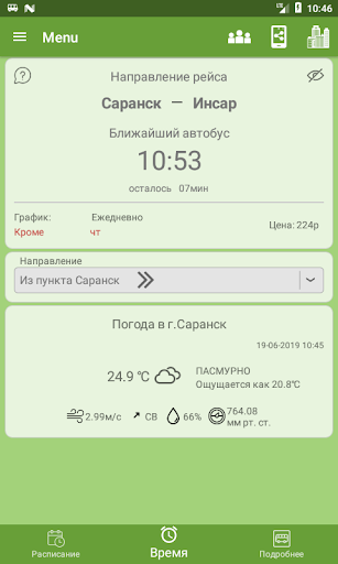 Приложение находит и отсчитывает время до ближайшего автобуса.