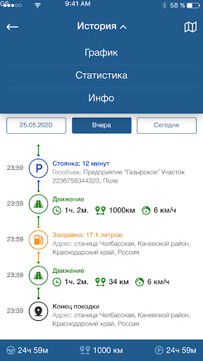 История: Контролируйте события объекта (движение, стоянка, заправка, слив) в хронологическом порядке и отображайте их на карте;