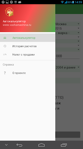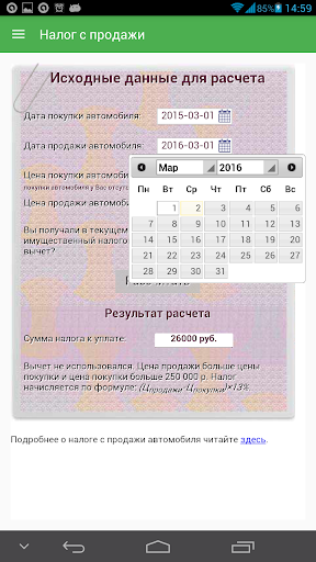 Также в приложении присутствует калькулятор расчета налога с продажи автомобиля.