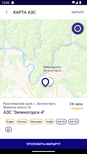 * Карта АЗС с возможностью фильтрации видов топлива и услуг и с возможностью проложить маршрут до АЗС;