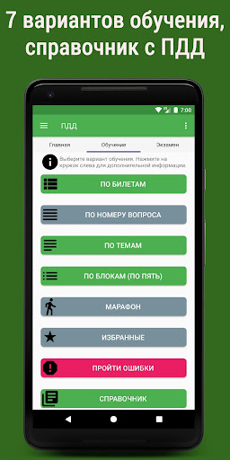 -обучение по четырем разделам ПДД (по 200 вопросов)