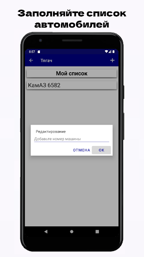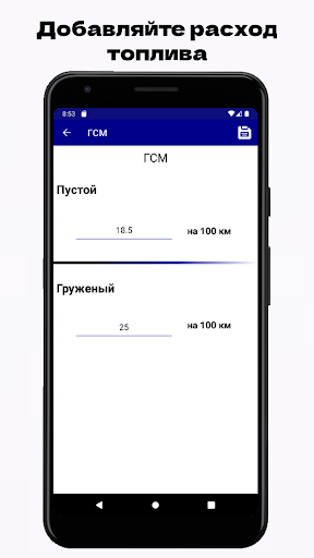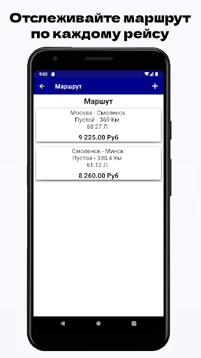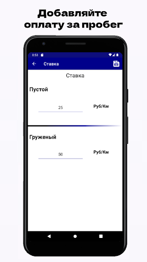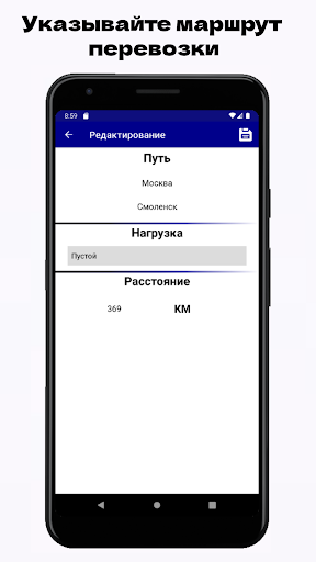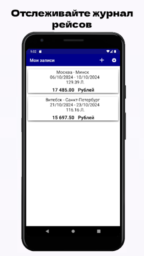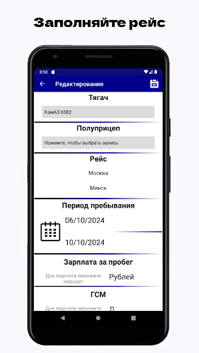 Приложение позволяет водителю фиксировать выполненные рейсы по маршруту, учитывать пробег по рейсу и рассчитывать примерную зарплату по рейсу исходя из оплаты за километр пробега, вести учет расхода ГСМ.