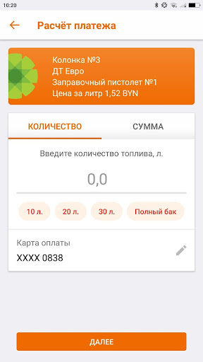 3) указать тип топлива и его количество в литрах или сумму, планируемую для заправки.