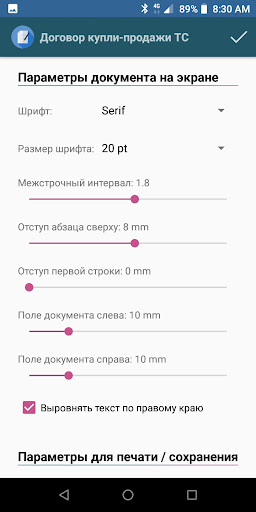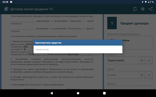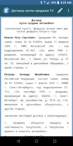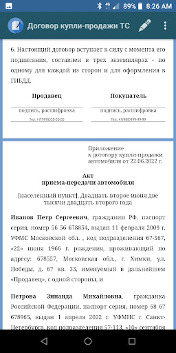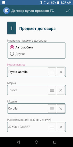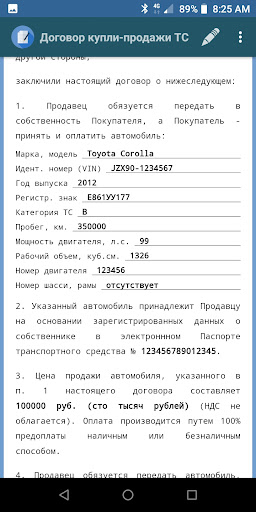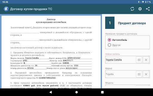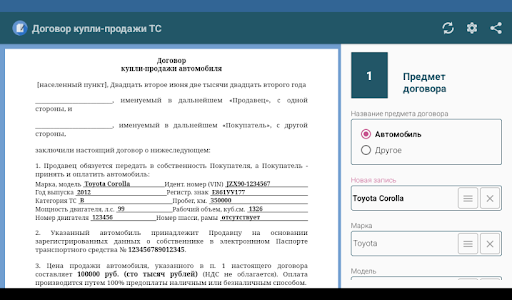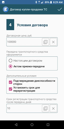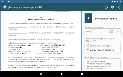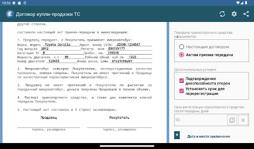 Приложение – конструктор “Договора купли-продажи ТС” позволяет быстро создать Договор купли-продажи автомобиля, мототехники, прицепа, других транспортных средств и номерных агрегатов, указав необходимые условия с минимальным ручным набором текста – с помощью элементов управления: списков и опций выбора вариантов составления документа. При указании соответствующих условий договора программа также формирует Акт приема-передачи транспортного средства, в качестве приложения к договору.
