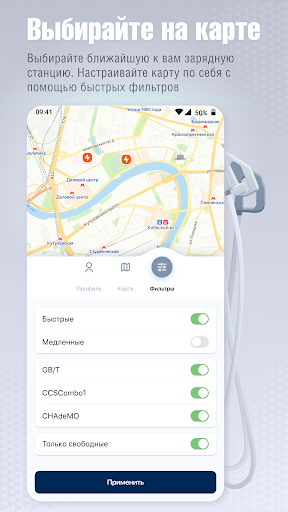 • Настроить карту для отображения станций, подходящих для вашего электромобиля.