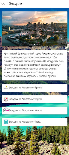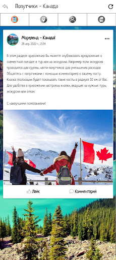 Бывает ситуация, когда Вы путешествуете один или парой, и вам хочется поехать на интересную экскурсию, но она стоит дорого, так как гид берет плату за группу. В этом приложении вы можете найти попутчиков для совместных экскурсий, и удешевить тур. В разделе приложения “Попутчики” опубликуйте свой пост и он будет виден другим пользователям приложения в радиусе 10 километров. А при нажатии на значок “геолокации” Вы и сами сможете увидеть другие такие предложения в радиусе 10 километров от Вас! Дополнительно в приложении можно совершить первичное знакомство с городами Канады, выбрать место для путешествия, посмотрев достопримечательности и видео обзоры. Также в приложении есть информация об экскурсионных бюро, тур агентствах и отелях, предлагающих свои услуги в Канаде.