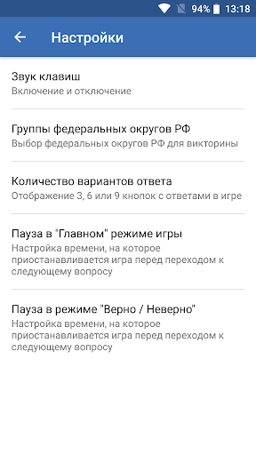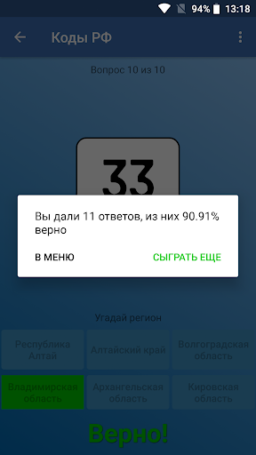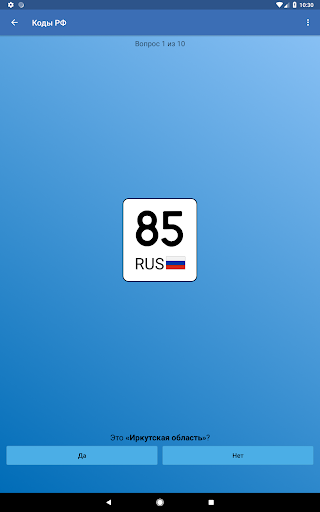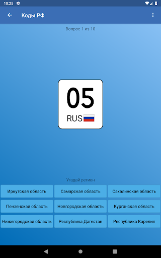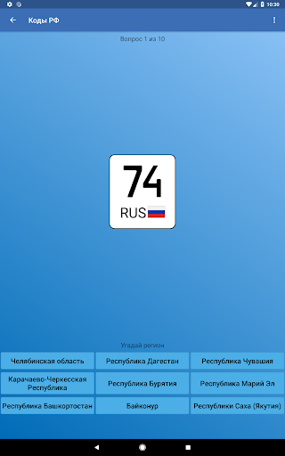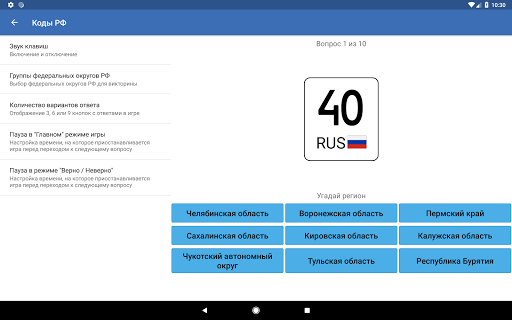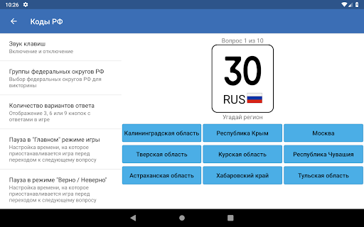 ✔ Гибкие настройки, в которых вы можете выбрать количество вариантов ответа (изменить сложность игры) и федеральные округа, чьи коды вы хотите выучить.