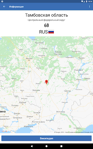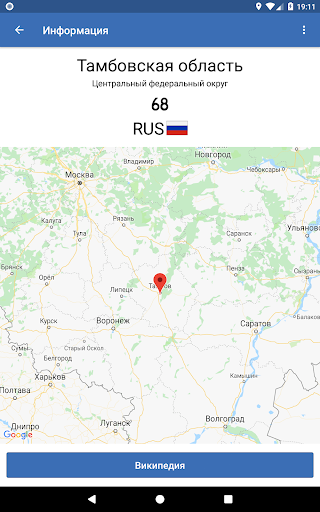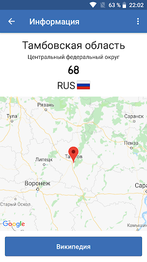 ✔ Нажмите на любой пункт в справочнике, и откроется окно с информацией о выбранном регионе: все коды, закрепленные за этим регионом, округ, в котором он находится, а также его карта и ссылка на Википедию.