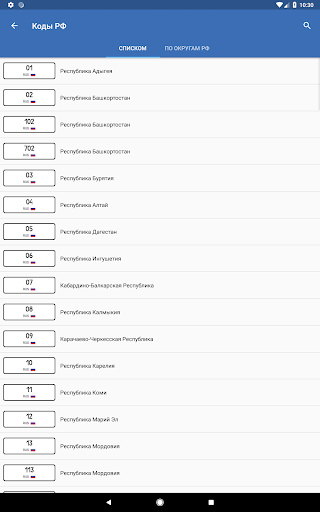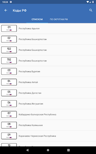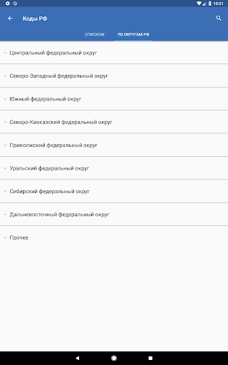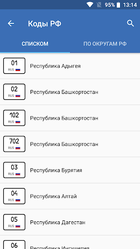 ✔ Удобный справочник, в котором вы также можете узнать, к какому региону относится искомый код. Информация выводится в виде списка с возможностью поиска как по цифровому коду, так и по названию региона. Кроме того, имеется возможность просмотра кодов по округам РФ.