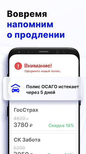 Вам не придется помнить дату окончания действия полиса и переживать о сроках – помощник ОСАГО напомнит за месяц до того, как закончится страховка авто и поможет продлить его по привлекательной цене за пару кликов!