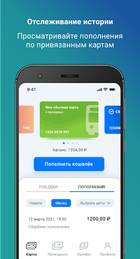 • Просматривать историю пополнений по добавленным транспортным картам